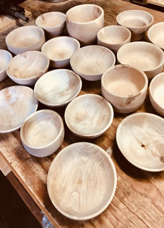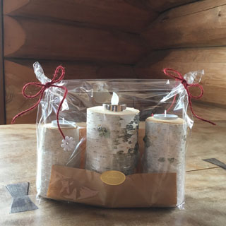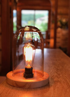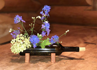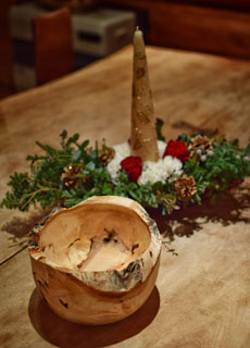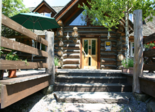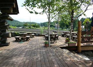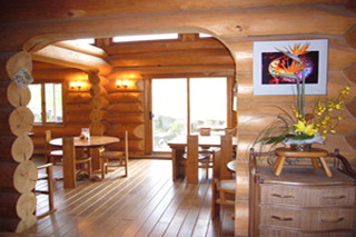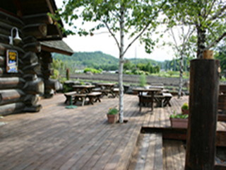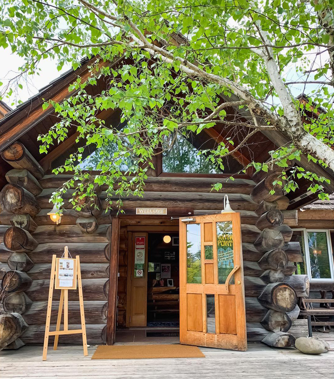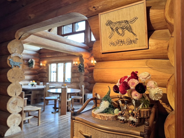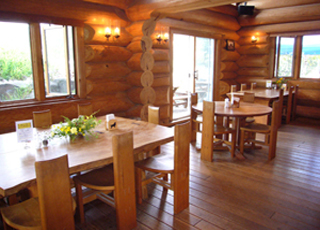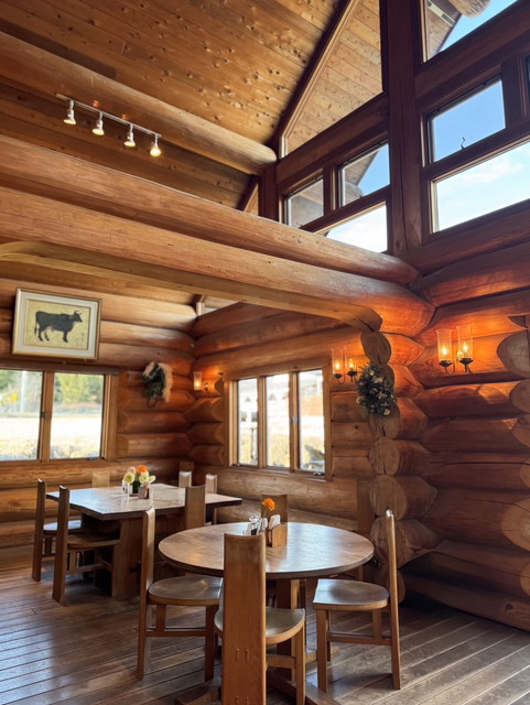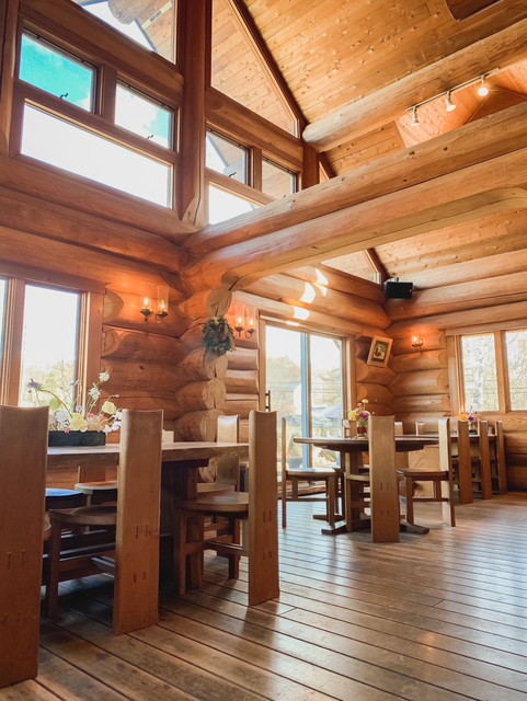 当店の建物は、日本三大銘木の一つである「北山杉」の大径木を贅沢に使用したログハウスです。木の香りが優しく包み込む館内は、ログハウスの力強さと洗練されたモダンな雰囲気が調和する、おしゃれな空間に仕上げました。
